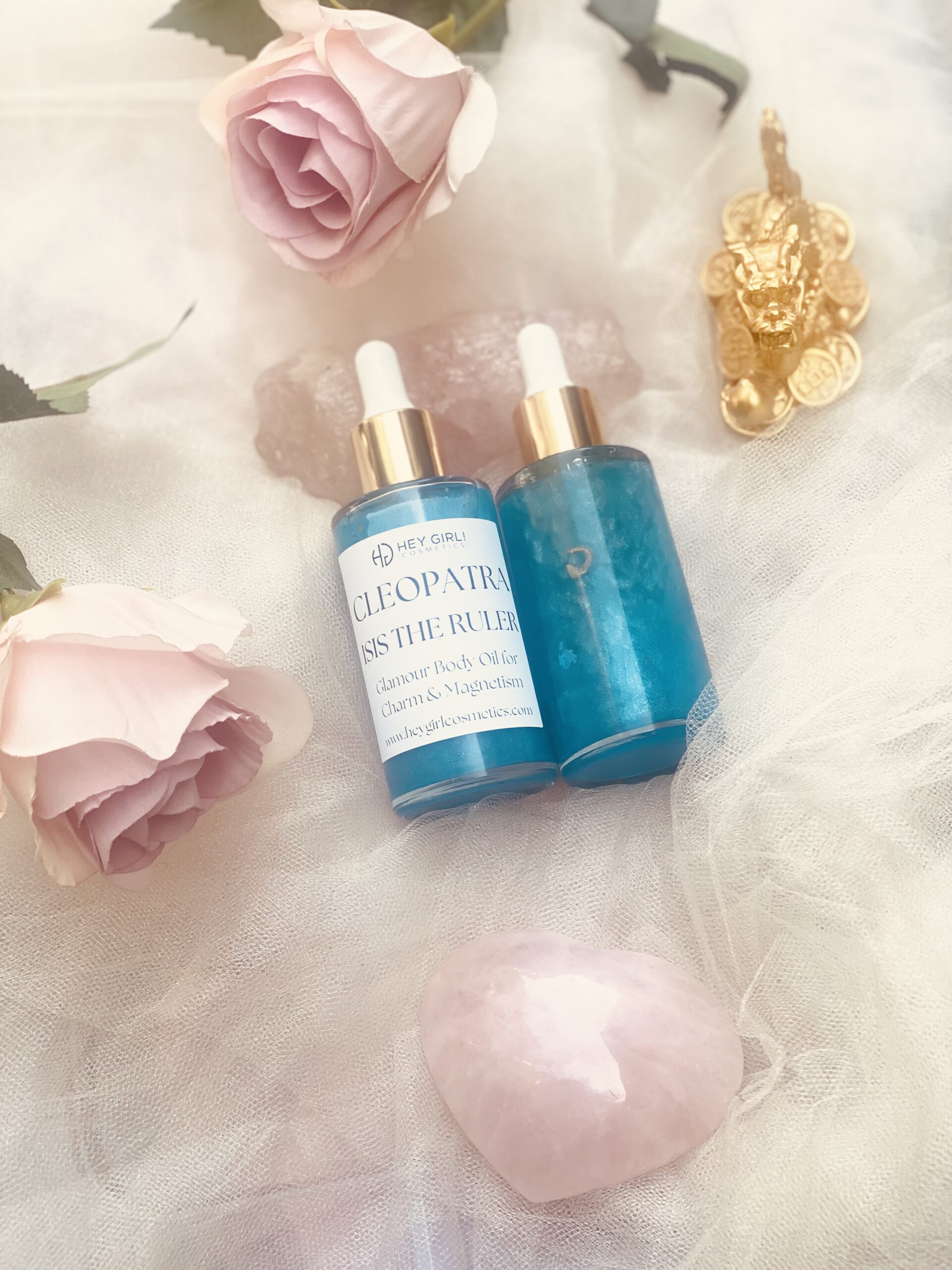 Cleopatra – Isis the Ruler is a radiant light blue shimmer body oil designed to illuminate your skin with a soft, enchanting glow. Crafted with nourishing sunflower and grapeseed oils and infused with luminous mica, this luxurious blend leaves the skin silky, hydrated, and beautifully highlighted.